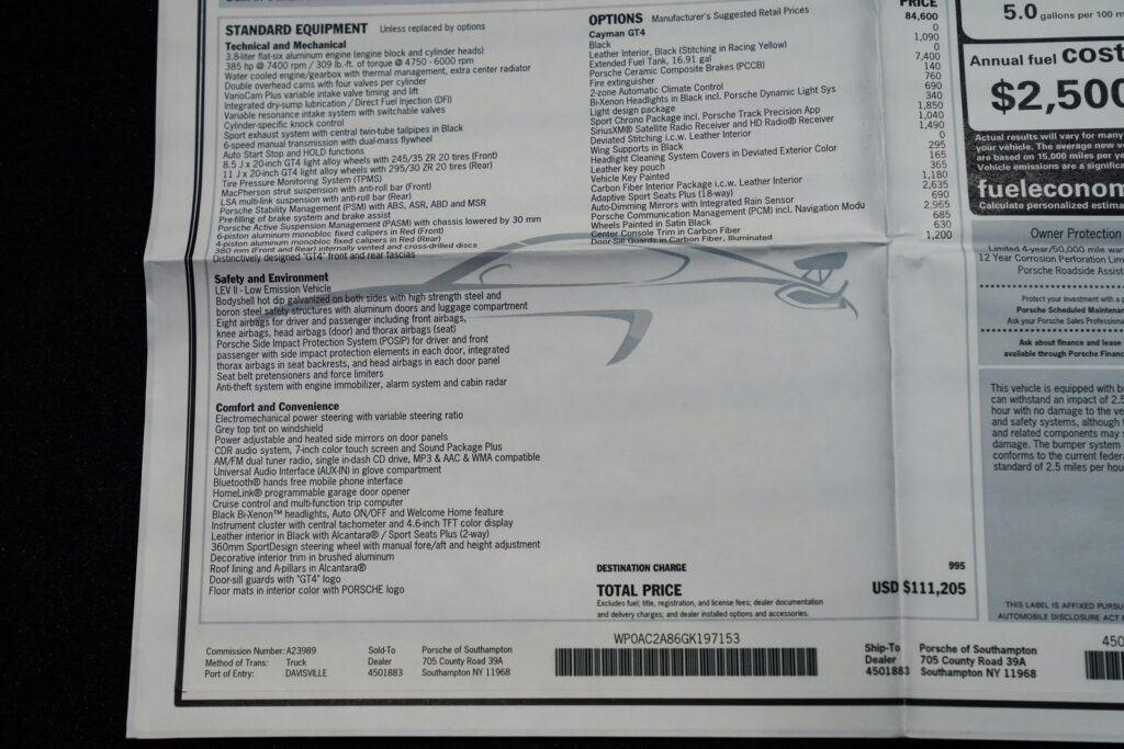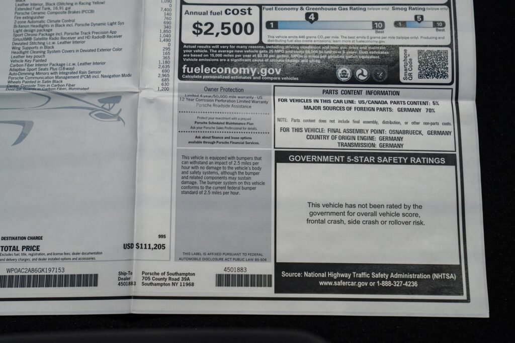 The window sticker notes initial delivery to Porsche of Southampton in New York and lists factory equipment, colors, options, and a total price of $111,205. A battery tender, manufacturer’s literature, and service records are also included with the car.