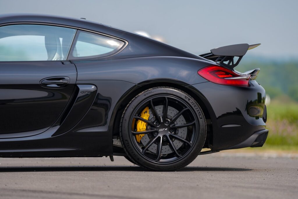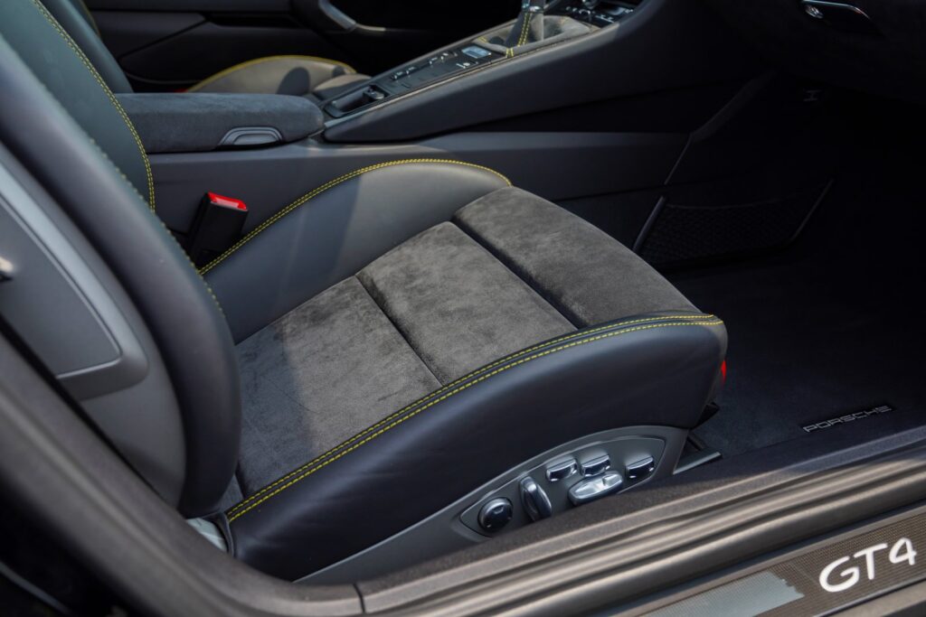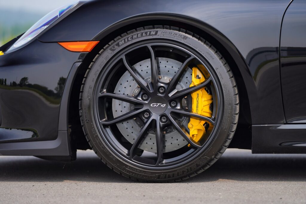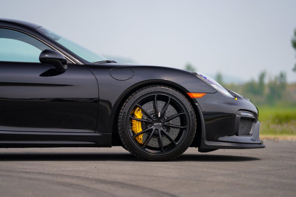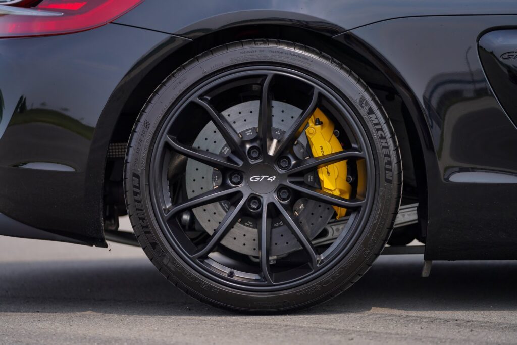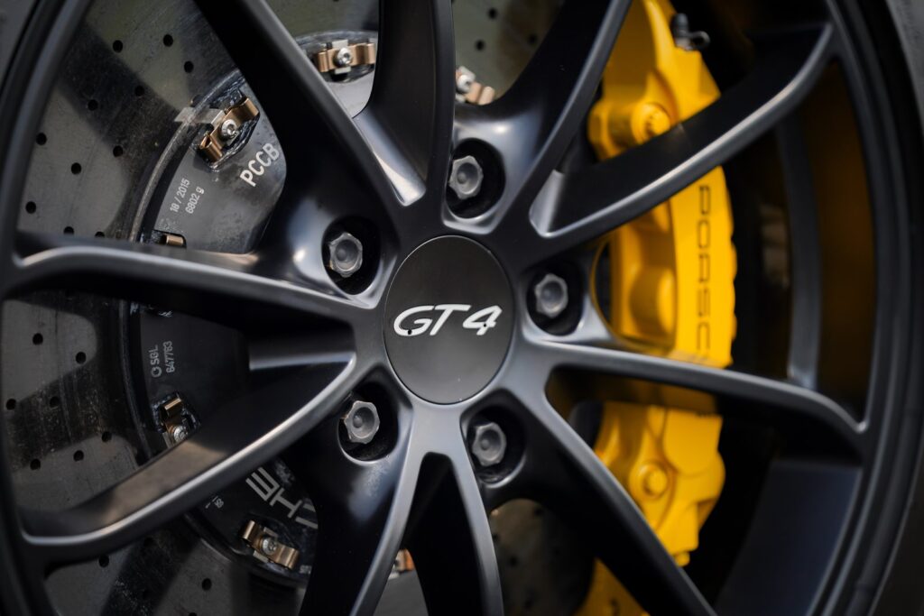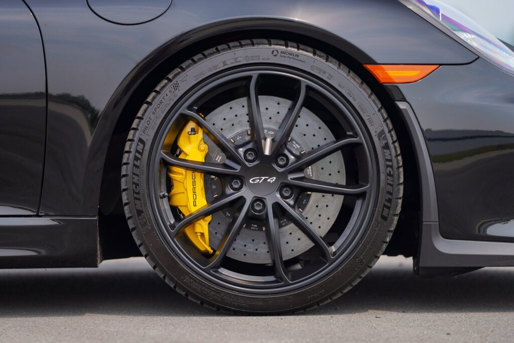 Satin Black 20″ GT4 alloy wheels were mounted with Michelin Pilot Sport 4S tires in October 2024. The car was ordered with optional $7,400 Porsche Ceramic Composite Brakes (PCCB) with yellow-painted Porsche-branded calipers. The GT4 utilized front suspension components from the 991.1 GT3 as well as a specially tuned multi-link rear setup, Porsche Stability Management (PSM), and PASM adaptive dampers. A brake fluid flush was performed in October 2024.