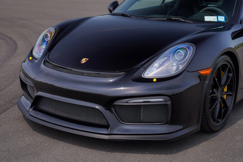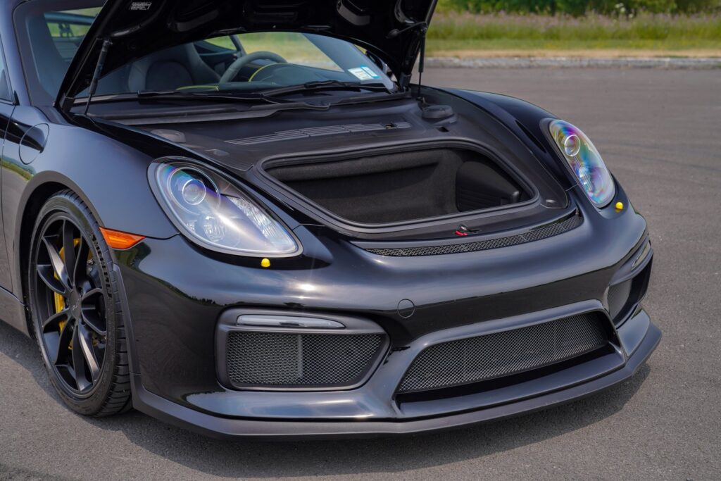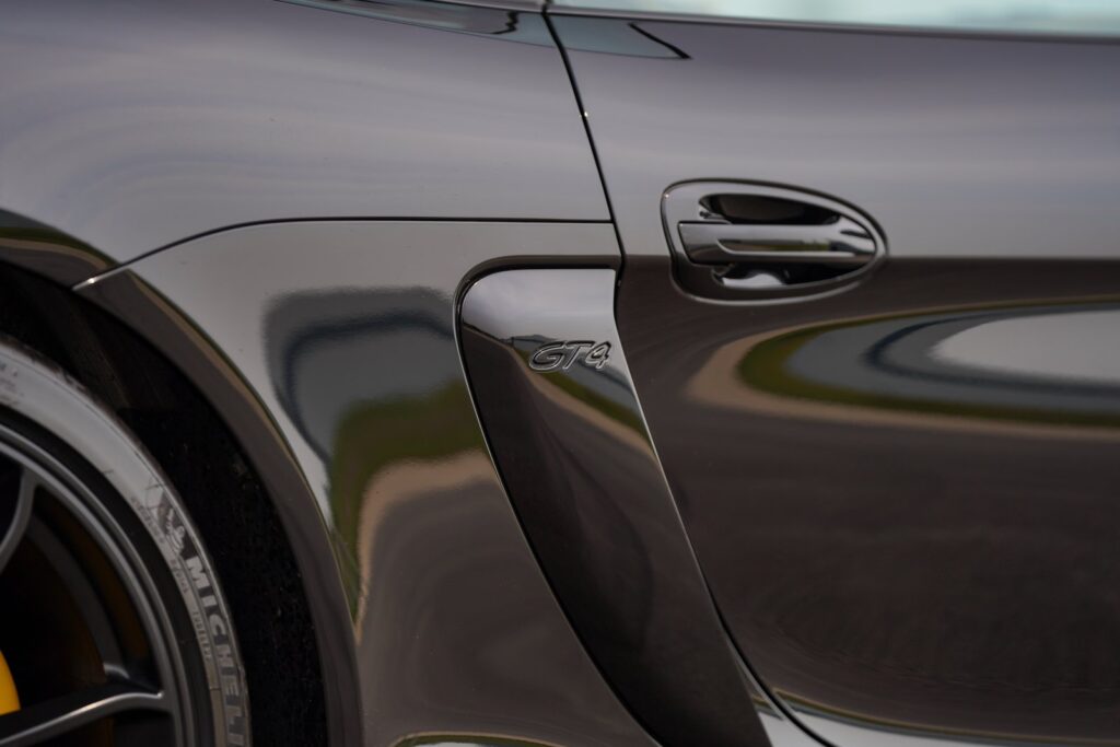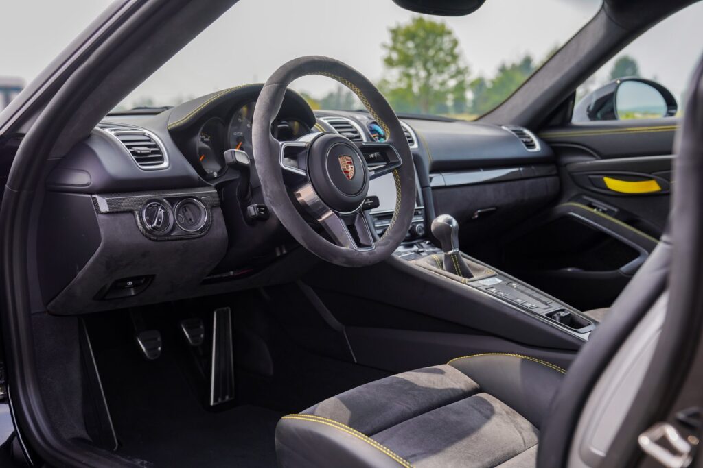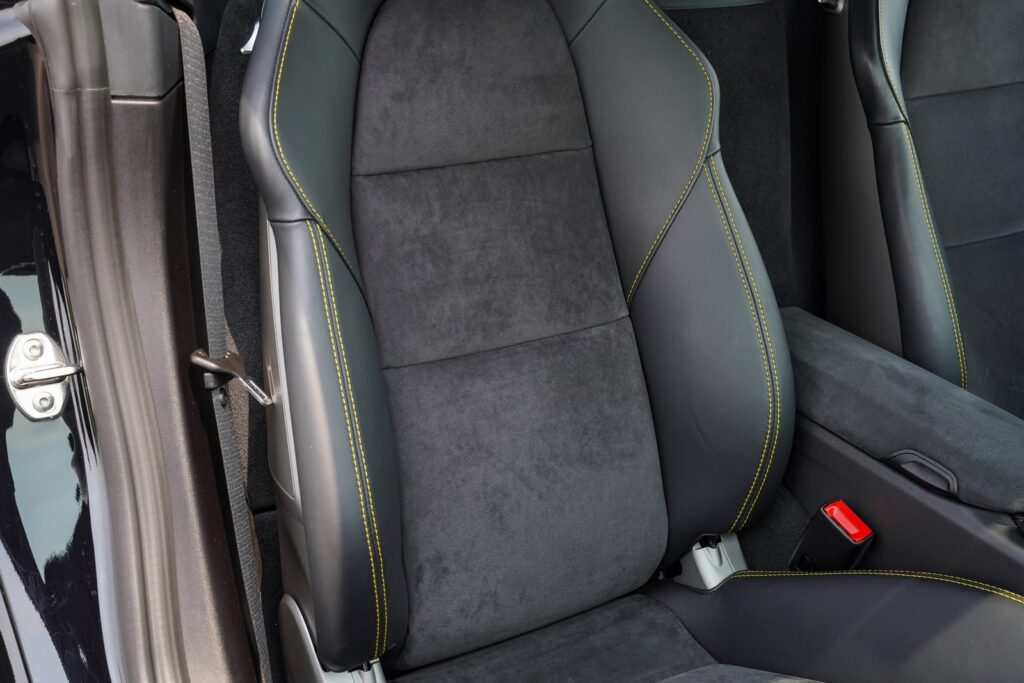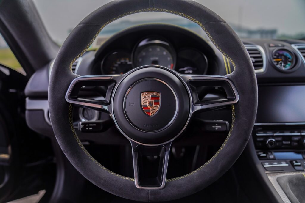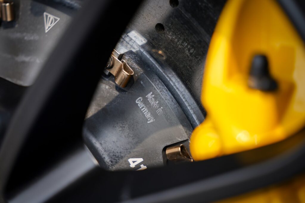 Satin Black 20″ GT4 alloy wheels were mounted with Michelin Pilot Sport 4S tires in October 2024. The car was ordered with optional $7,400 Porsche Ceramic Composite Brakes (PCCB) with yellow-painted Porsche-branded calipers. The GT4 utilized front suspension components from the 991.1 GT3 as well as a specially tuned multi-link rear setup, Porsche Stability Management (PSM), and PASM adaptive dampers. A brake fluid flush was performed in October 2024.