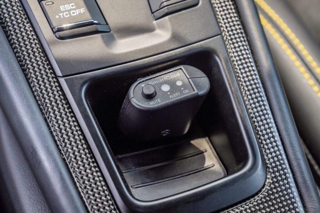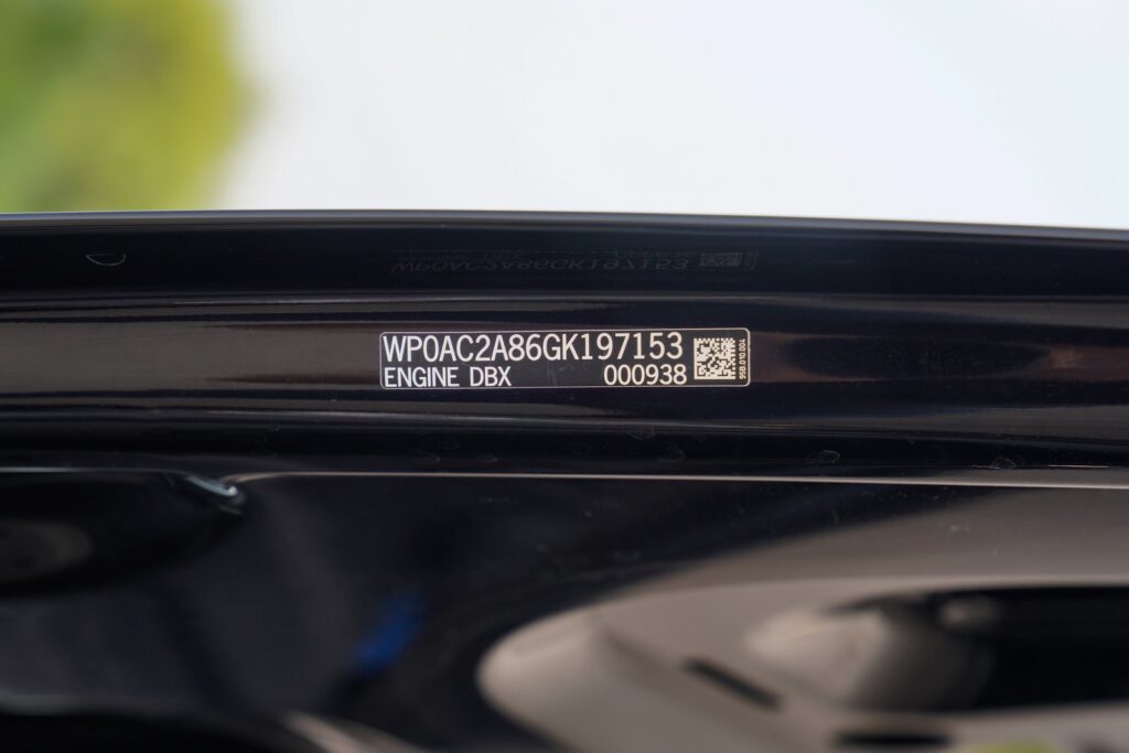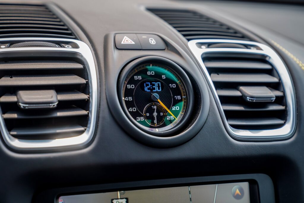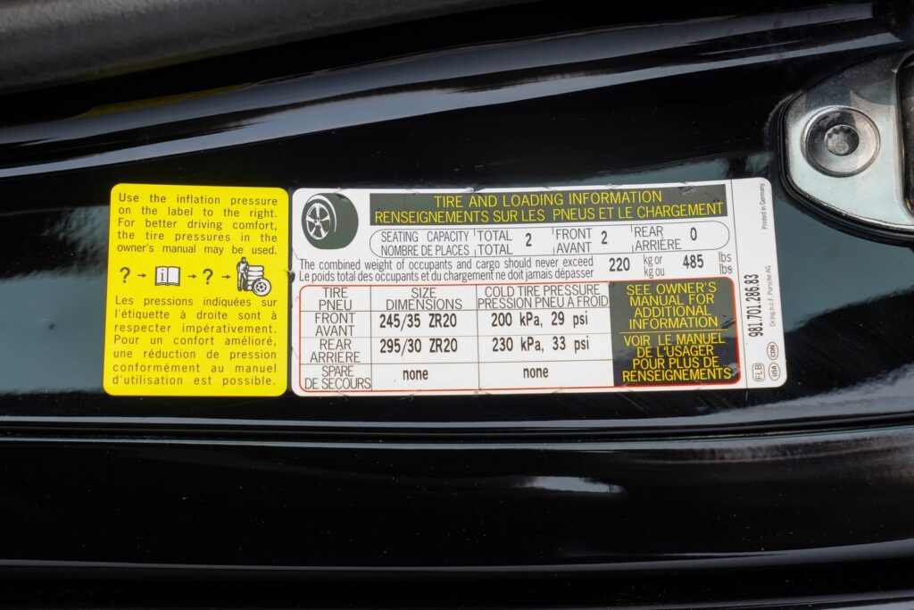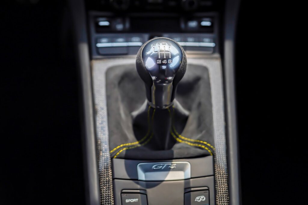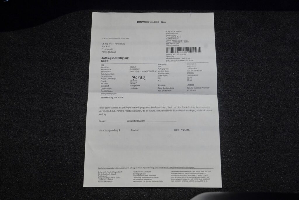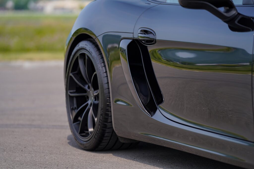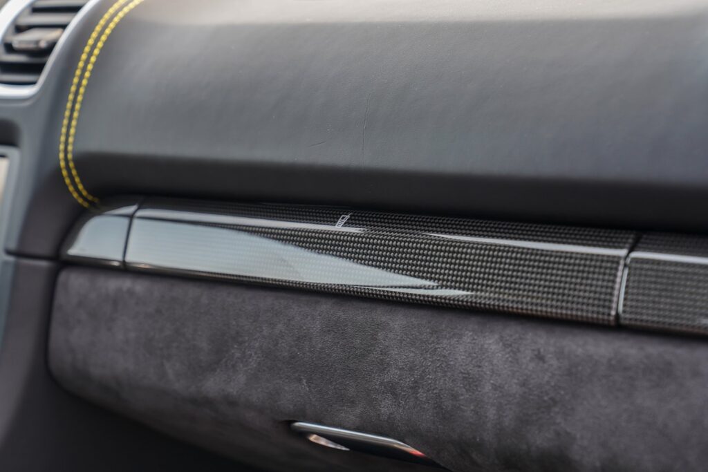 Satin Black 20″ GT4 alloy wheels were mounted with Michelin Pilot Sport 4S tires in October 2024. The car was ordered with optional $7,400 Porsche Ceramic Composite Brakes (PCCB) with yellow-painted Porsche-branded calipers. The GT4 utilized front suspension components from the 991.1 GT3 as well as a specially tuned multi-link rear setup, Porsche Stability Management (PSM), and PASM adaptive dampers. A brake fluid flush was performed in October 2024.