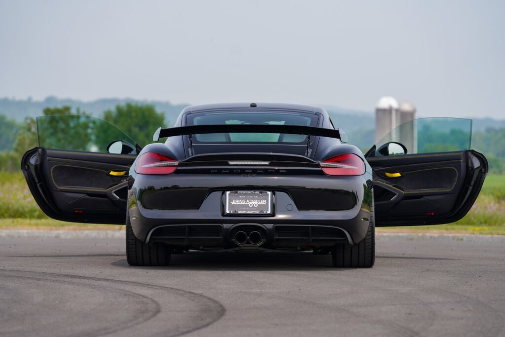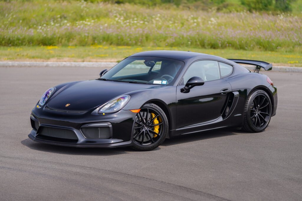 The Black-over-Black coupe is powered by a 3.8-liter flat-six paired with a six-speed manual transaxle and is further equipped with the Sport Chrono, Carbon Fiber Interior, and Light Design packages as well as a Sport exhaust, Satin Black 20″ GT4 wheels, and PCM with navigation. The seller purchased the car as a Porsche Approved Certified Pre-Owned vehicle in 2019 and has since added approximately 5k miles. This 981 Cayman GT4 Sold with a window sticker, a battery tender, service records, a clean Carfax report.