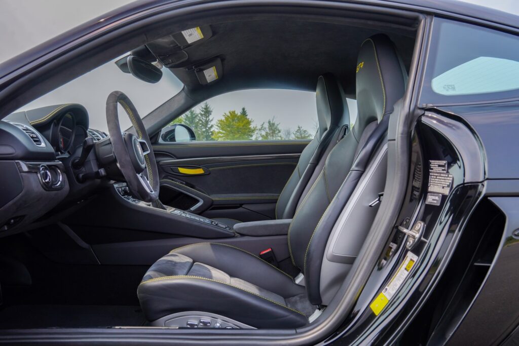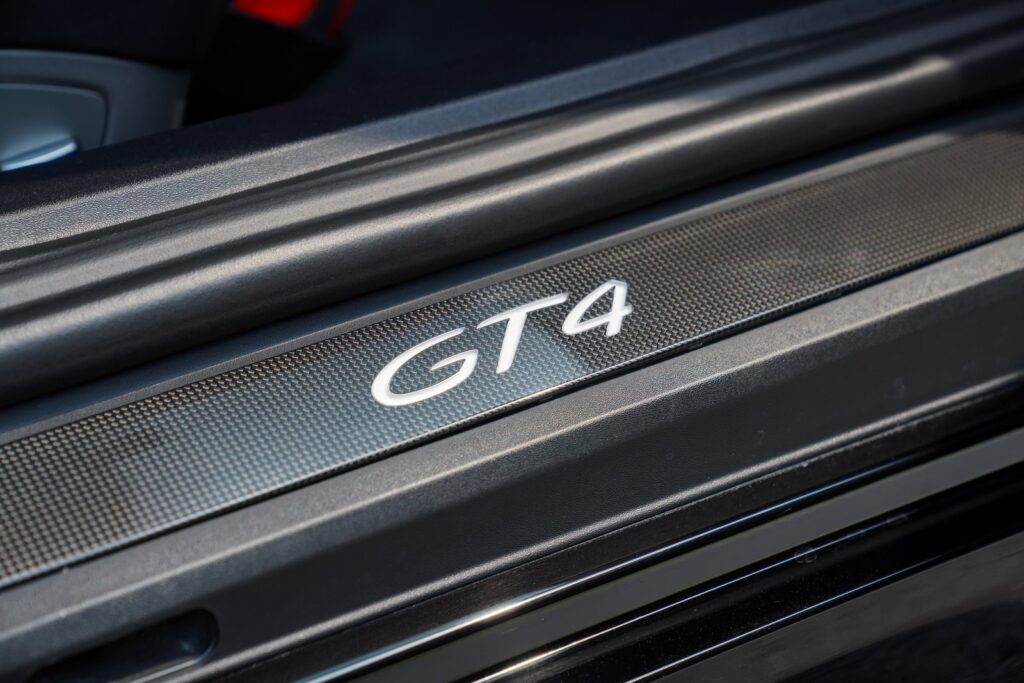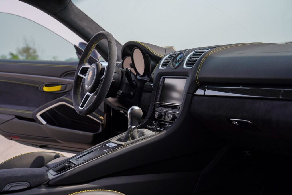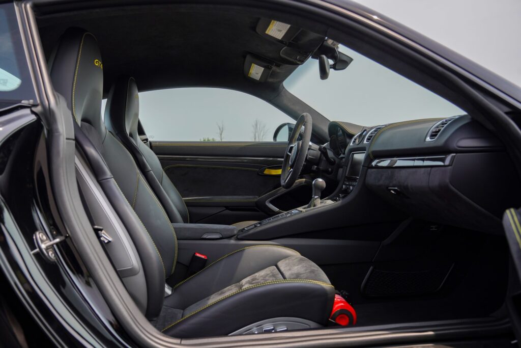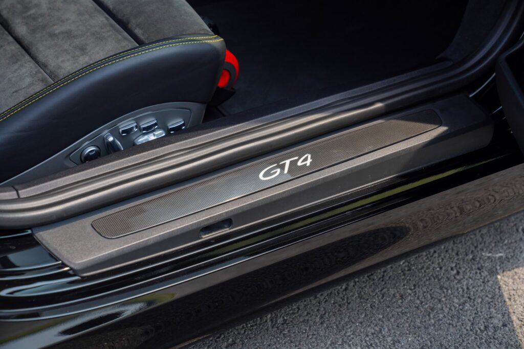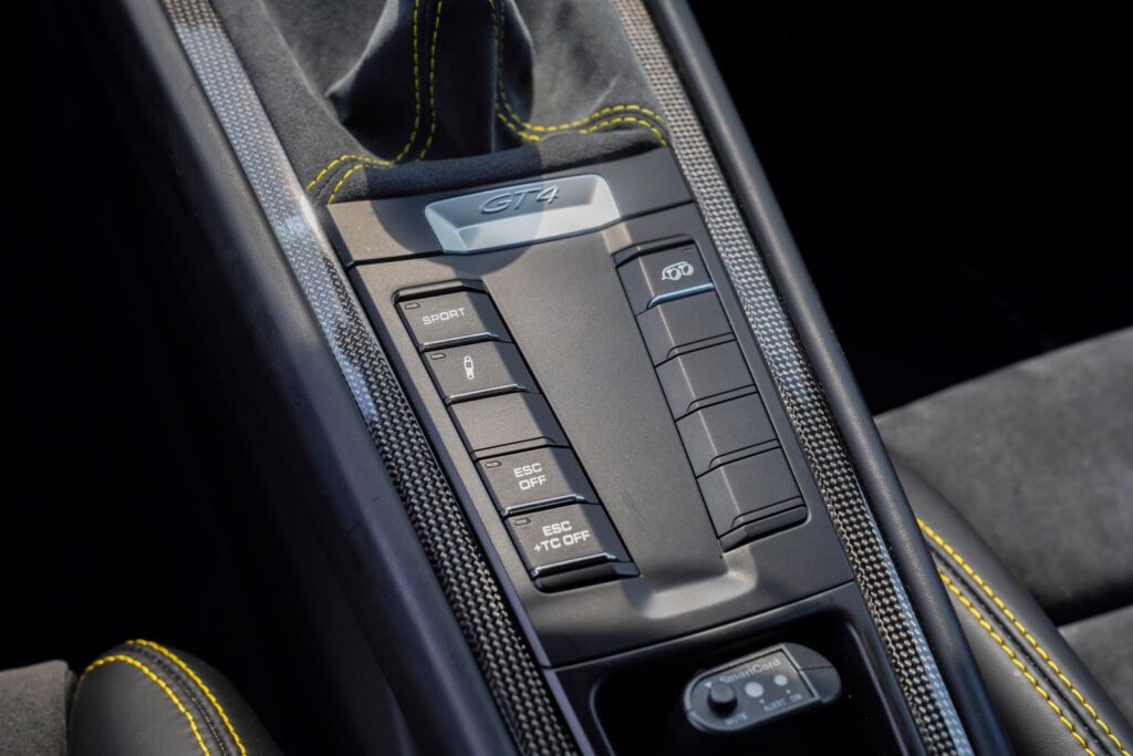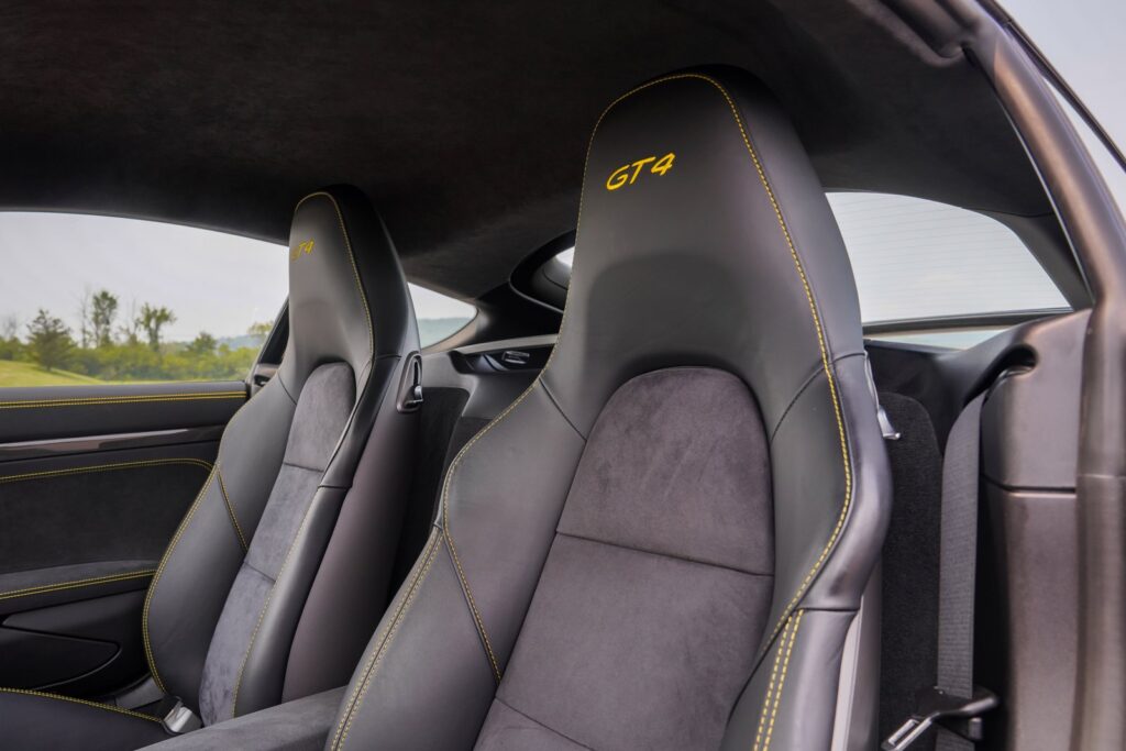 The 18-way power-adjustable Adaptive Sport Seats Plus are trimmed in Black leather and Alcantara with Racing Yellow stitching and “GT4” headrest embroidery. Matching hide and thread extend to the dashboard, shift boot, and door panels, while carbon-fiber trim adorns the dash, center console, and doors. Further appointments comprise Porsche Communication Management (PCM) with navigation as well as dual-zone automatic climate control, cruise control, the Light Design Package, and illuminated GT4-branded carbon-fiber door sill guards. A fire extinguisher is mounted in the passenger footwell.
