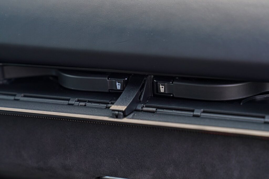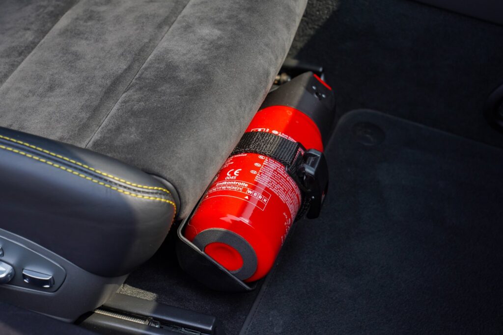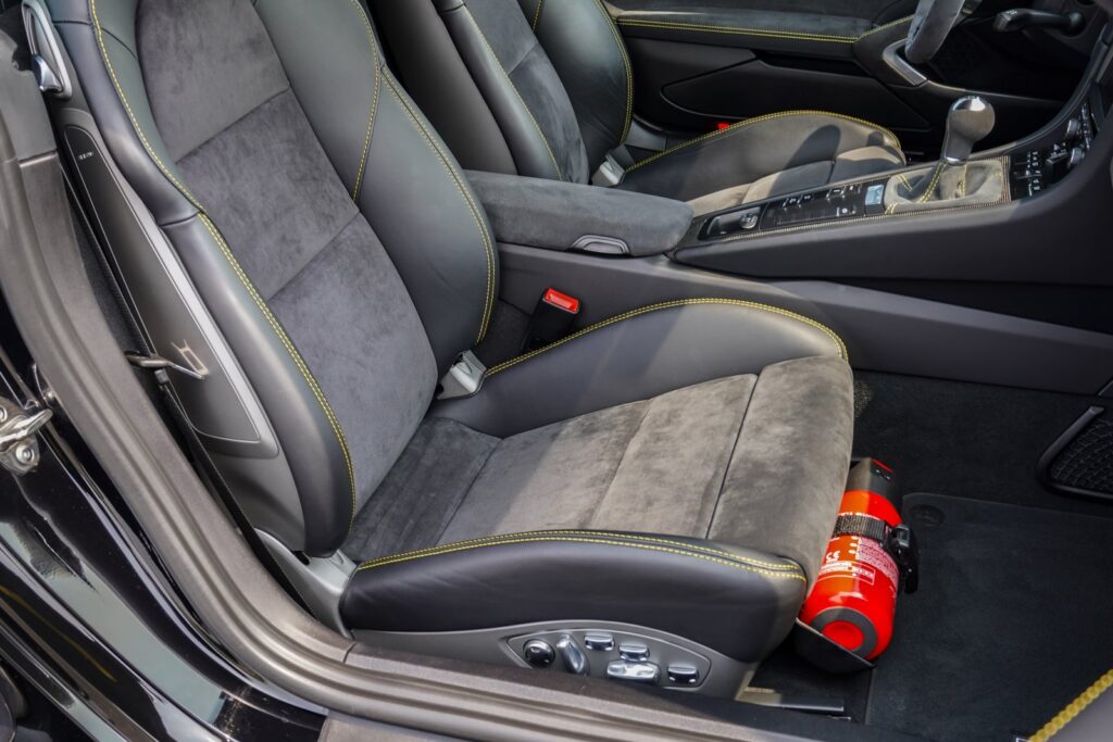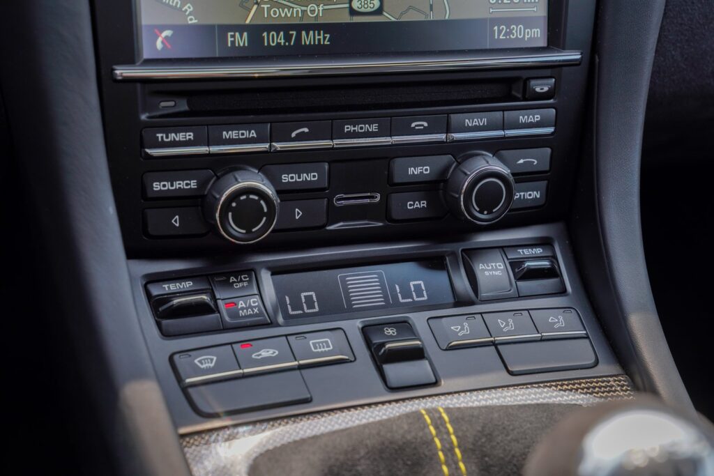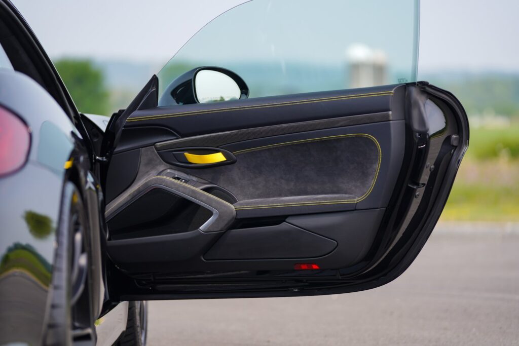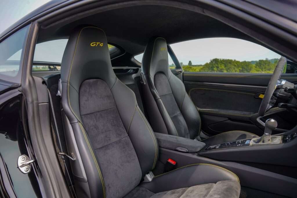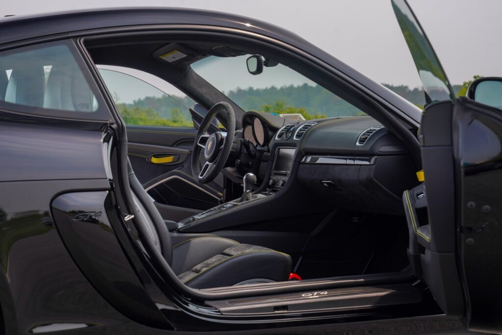 The 18-way power-adjustable Adaptive Sport Seats Plus are trimmed in Black leather and Alcantara with Racing Yellow stitching and “GT4” headrest embroidery. Matching hide and thread extend to the dashboard, shift boot, and door panels, while carbon-fiber trim adorns the dash, center console, and doors. Further appointments comprise Porsche Communication Management (PCM) with navigation as well as dual-zone automatic climate control, cruise control, the Light Design Package, and illuminated GT4-branded carbon-fiber door sill guards. A fire extinguisher is mounted in the passenger footwell.