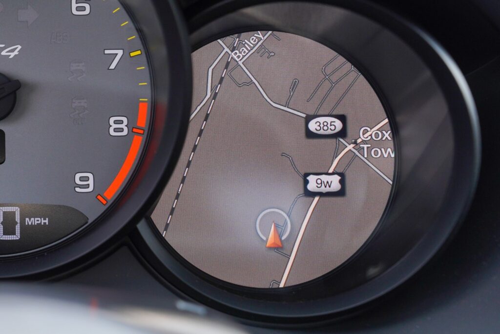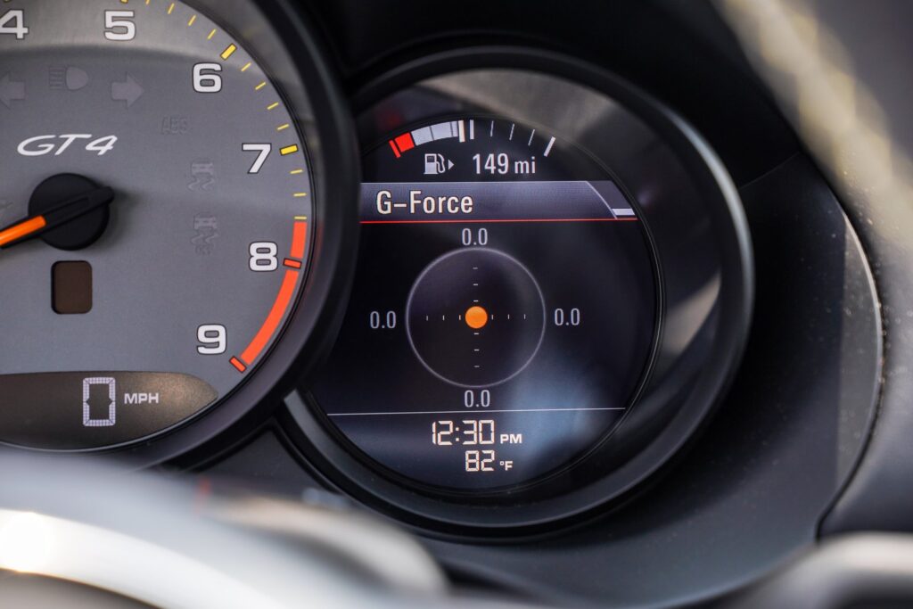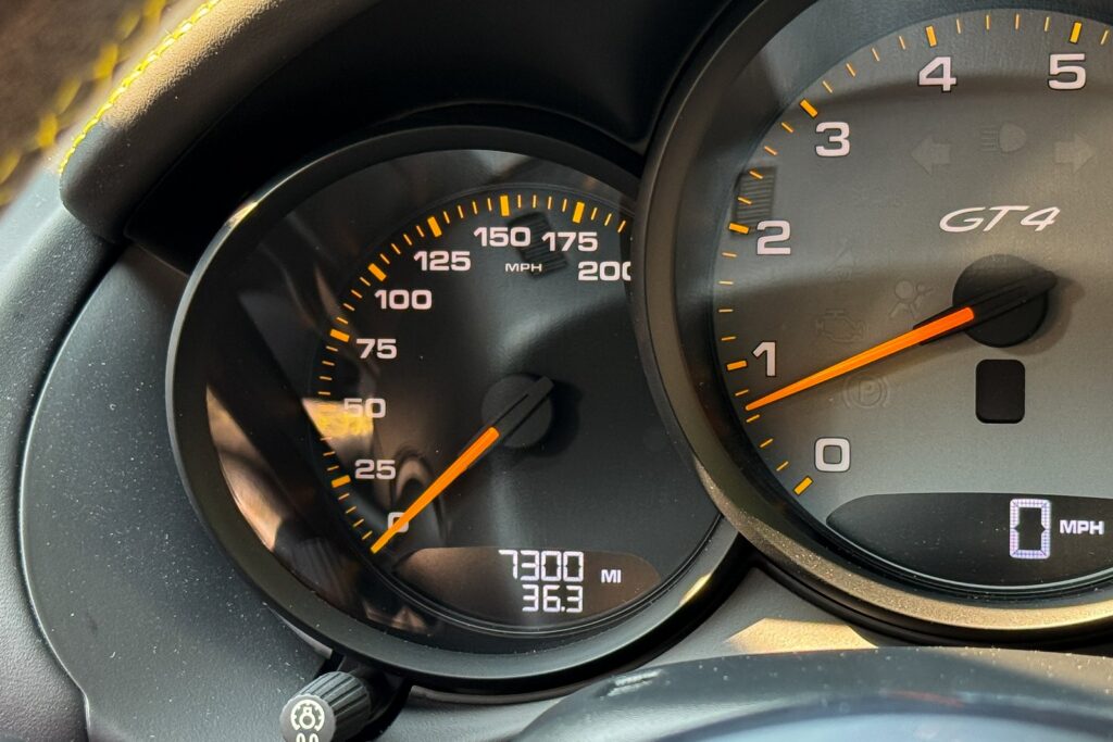 The Alcantara-wrapped Sport steering wheel frames a GT4-branded central tachometer with a 7,600-rpm redline as well as a 200-mph speedometer and a digital display. The optional Sport Chrono Package added a stopwatch in the center stack. The digital odometer indicates 7k miles, approximately 5k of which were added under current ownership.